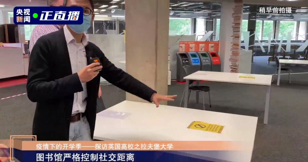 图书馆用户体验经理马修向记者白桦介绍了其他措施,例如一般是会有4个学生围着这样的桌子坐着学习,现在只放一张椅子,放置标识保证安全距离;因为图书馆有电脑有书桌,所以到处配备免洗消毒液、消毒纸巾等,尽量避免交叉感染的可能性。