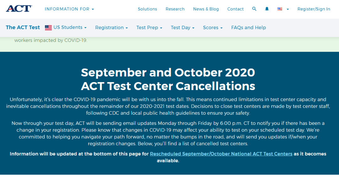 现在,ACT已发布已取消的考试中心列表,当前列表涉及500多个测试中心,后续可能还会继续增加。