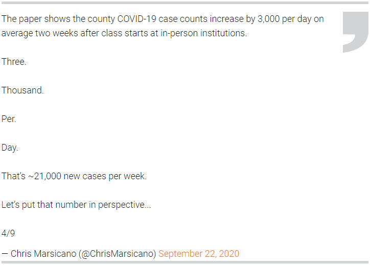 研究人员还发现,在那些开放校园进行现场教学的高校及周边地区,每天每10万人中平均增加2.4例。这种情况在感染高风险的州更为明显。