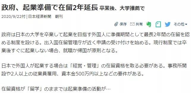 此前,日本政府2018年在部分地区开设了“留学生大学毕业后可以停留1年准备创业”的特例,这一制度现在可以在10道府县市使用,但应用实例仅有20人。
