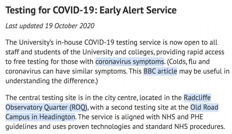 牛津大学10月19日消息,大学内部的新冠检测服务现已向学校内所有教职员工和学生开放,出现症状的人可以免费测试 。