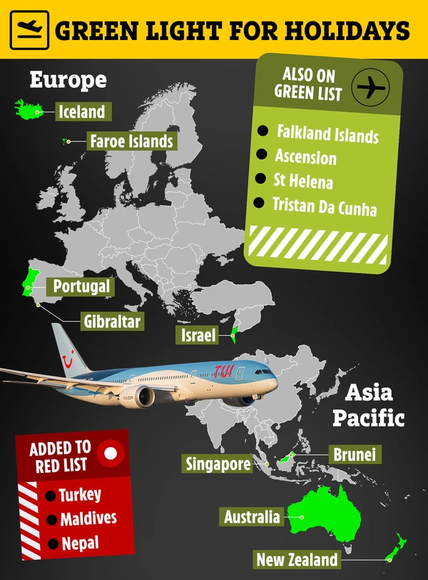 5月17日生效后,英国居民可以出境前往“绿色名单”地区度假,但仍不可前往 amber list countries和red list countries地区度假。